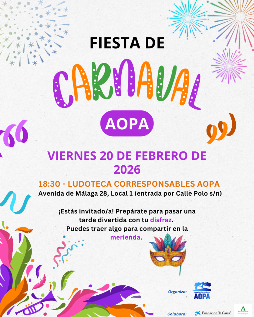 El próximo viernes 20 de febrero de 2026 realizaremos, un año más, nuestra fiesta particular de CARNAVAL, con música, baile y merienda compartida entre todas las familias de la asociación e invitados/as que vengan.