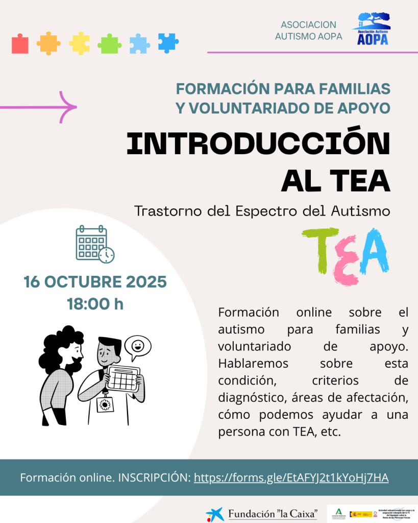 El próximo jueves 16 de octubre a las 18:00 programamos esta formación para familias y voluntariado de apoyo sobre el TRASTORNO DEL ESPECTRO DEL AUTISMO. Hablaremos sobre esta condición, criterios de diagnóstico, áreas de afectación, cómo podemos ayudar a una persona con autismo, etc.